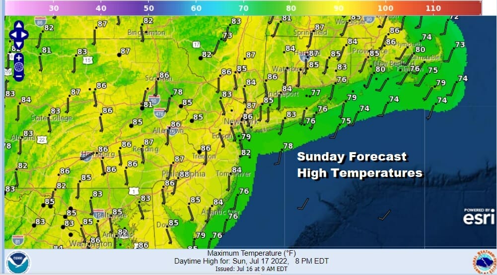 This is likely to be the hottest week of weather for New Jersey so far this summer. Ahead of the heat and high humidity we have a warm and humid Sunday with clouds and some sun with highs reaching the mid to upper 80s. There may be some scattered showers and thunderstorms late this afternoon into this evening.