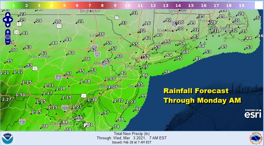 This hasn’t been exactly a good weekend but it is the last weekend of February and that puts us in meteorological spring Monday. Temperatures rise their fastest over the next 3 months. The average high starts March in the mid 40s and by the end of the month it is in the mid 50s or basically 1 degree every three days. Unfortunately the averages and reality rarely agree and we have a week ahead that does look to be colder than average. Before that we have a cloudy satellite picture and the next round of rain and showers.