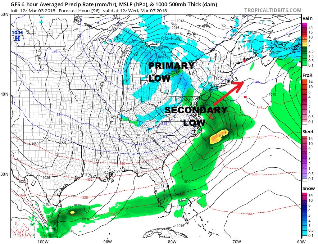 The strong blocking pattern continues across much of Eastern Canada out to Greenland. This is continuing to send energy across the United States from west to east. Much like what happened with yesterday’s major coastal storm, this next low will try to go northward only to be stopped by the block to the north. This is going to create another scenario where the primary low weakens and a secondary low redevelops.