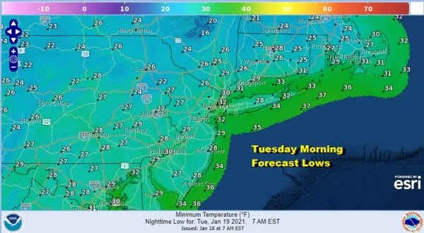 Tuesday will be like today except that temperatures will be a few degrees lower. Look for sunshine and a few clouds Highs will be in the lower 40s. Then it turns a little colder Tuesday night into Wednesday morning with lows in the 20s to near 30. Wednesday will be cold and at least close to average for this time of year. Highs will be in the 30s under partly sunny to mostly cloudy skies. Another little push of colder air comes in and takes us down to the teens to mid 20s Thursday morning.