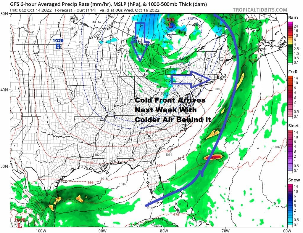 We will start to feel the arrival of the colder air later in the day Monday once the front moves offshore. We will likely top out in the 60s Monday and then see temperatures to trend lower later in the day and certainly for Monday night into Tuesday.