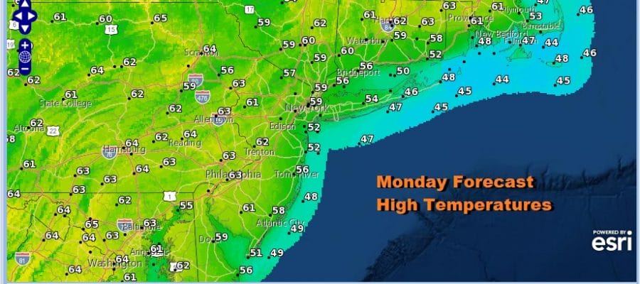Monday should be a sunny day with most highs ranging from the mid 50s to the east and along the coast. Lower 60s are likely inland. We could see some clouds developing along coastal areas Monday night but sunshine should break through any clouds on Tuesday. Highs inland will reach into the 60s but again 50s will be the rule along the coast and especially along east facing shorelines.