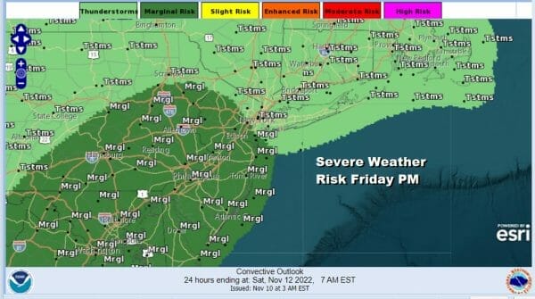 Severe weather risk is on the table for later Friday and Friday night. The Storm Prediction Center has pushed up the marginal risk area further north in their forecasts. This means we have the risk for isolated stronger or severe thunderstorms getting into the mix. With the front and the low closing in we will see gusty winds developing Friday night.
