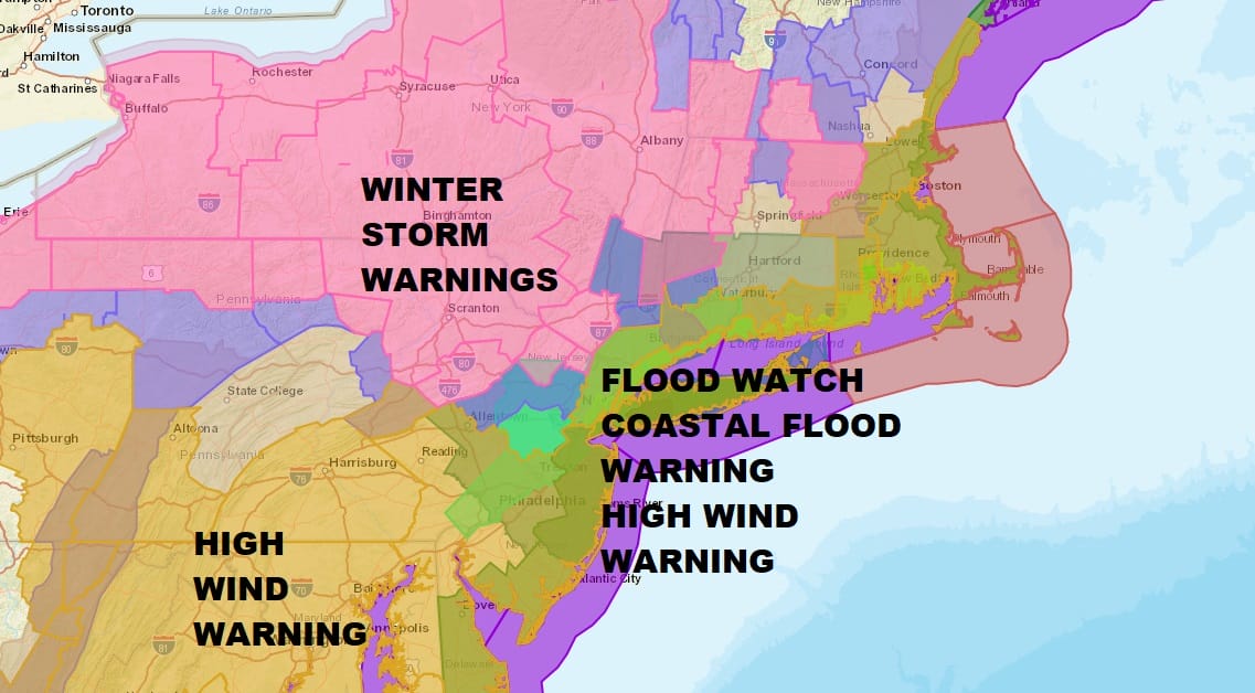 We continue to see the watches and warnings map lit up like a Christmas tree. Winter Storm Warnings continue across Northeast Pennsylvania and Northwest New Jersey. Warnings have been expanded across the Hudson Valley and parts of Northwestern Connecticut. Winter Weather Advisory is up for Warren & Morris Counties in New Jersey as well as Putnam County and Southern Litchfield County. There are numerous overlapping watches and warnings including Flood Watches for rain, Coastal Flood Warning for tidal flooding and High Wind Warnings as the winds will be cranking up to 50 to 60 mph along the coast later today and tonight. As far as snow is concerned we are seeing areas north and west of the coast changing over to heavy wet snow especially in elevated areas. This should continue into this afternoon. How far south and east the change over occurs remains to be seen. Maps have been updated but may be updated again later today so be sure to check back on this page every couple of hours.