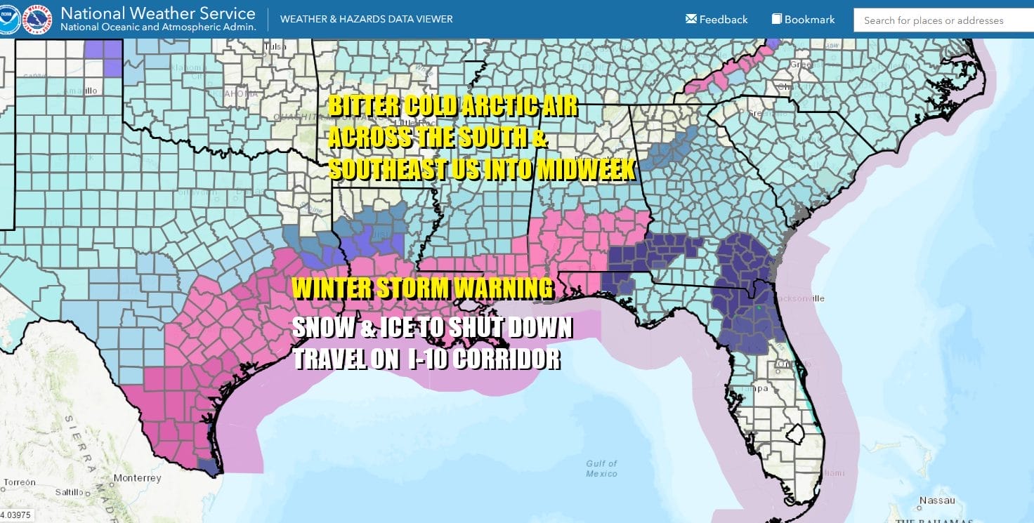 Areas from East Texas from San Antonio and Corpus Christi northeast to the major cities of Houston and New Orleans are about to experience what could be a crippling snow and ice storm over the next 2 days. Winter Storm Warnings are posted from the National Weather Service in places where you can go 10 or 20 years without ever seeing a snow flake or an ice pellet. Many of these cities and towns along the I-10 corridor have no means of removing snow from roadways. Given the bitter cold arctic air that covers the Deep South, this certainly shut down normal travel along the I-10 corridor from Houston to New Orleans and possibly eastward to the Florida Panhandle. Some airports in this are like Houston for example have already pre announced they will be shutting down ahead of this storm system.