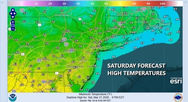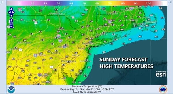 We should warm up some Sunday especially if we can manage a little sunshine in the mix which I think we can at least through the first half of the day. Temperatures Sunday should reach the 60s just about everywhere. In South Jersey and points south, highs will reach the upper 60s and lower 70s as these areas likely see a bit more in the way of sunshine and the front impacts take a little longer to make their way south.