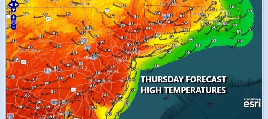 The launching pad to a third day of highs reaching above 90 degrees was set this morning when lows in many areas couldn’t even break below 60 degrees. We continue to see a frontal boundary lying across Upstate New York through Central New England. Thunderstorms and severe weather are possible along the I-90 Corridor from west to east. However to the south across Eastern Pennsylvania to Southern New England it will be a mainly sunny hot day with highs once again reaching the upper 80s and lower 90s. Temperatures at the shore will be cooler but even coastal areas will probably reach the upper 70s to around 80 degrees before local sea breezes come in. No showers or thunderstorms are in the forecast for today.