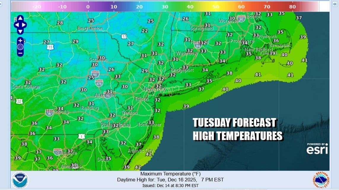 We are going to see temperatures not drop as low tonight as a southwest flow takes over. Most lows tonight will be in the 20s with teens inland. There should be enough of a breeze to keep temperatures relatively uniform. Wednesday we will see temperatures finally approach normal or even a shade above normal. Skies should be no worse than partly sunny and highs will reach the 40s by afternoon.