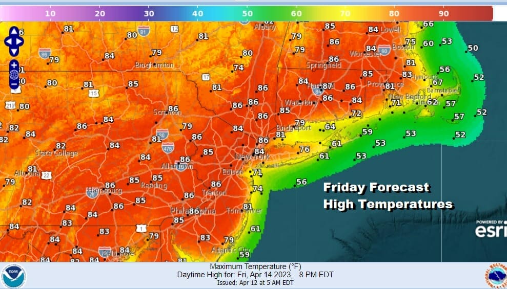 Yesterday we saw the first 90 degree highs for the season and a number of record highs were set. Today we will have another run at record highs this afternoon. We are going to squeeze out one more day of sunshine as we lie in between the northwest flow well to the north in Northern Maine and a weakening upper air system in the Southeast US that is moving northward. With sunshine. and a west to southwest wind, we will see highs againr reach the upper 80s to lower 90s away from the ocean and south facing shorelines. There may be more of a sea breeze this afternoon and it may come in a bit sooner than the past few days.