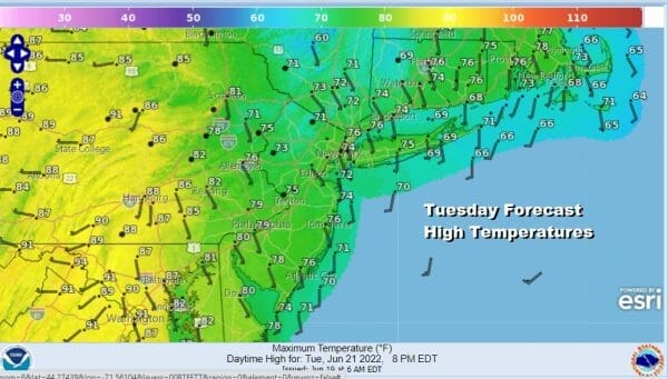 Temperatures overnight will be mostly in the mid 50s to lower 60s. Showers will move southward from upstate NY during the day Tuesday. We will paint a broad brush chance for showers for everywhere from Eastern Pennsylvania to Southern New England. Tuesday highs will be mostly in the 70s east of the warm front and warmer 80s to the west and that would mainly be west of I 81.