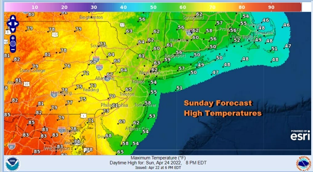 The “Curse of the Onshore Flow” is playing out today but at least it seems to be doing it with not much in the way of clouds We see thema on the satellite from Northwestern to Southeastern New England but there isn’t enough to keep us out of sunshine. Temperatures are going to be responding to an east wind near the coast and to more of a south wind inland. This produces a wide range of temperatures ranging from the 40s along the immediate coast of Southeastern New England and south and east facing shorelines. Just inland we climb to the 50s and 60s and from Western New Jersey westward we get into the 70s and 80s as the high temperature map shows.