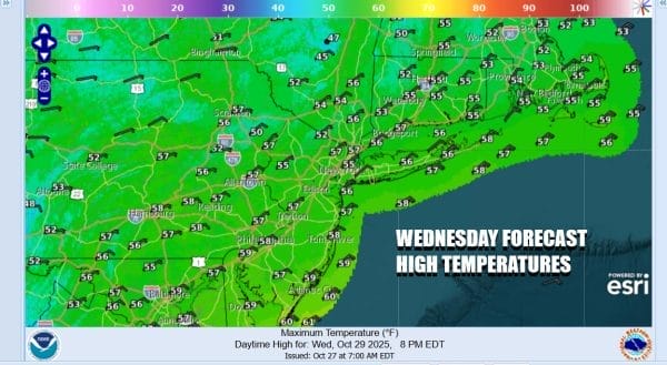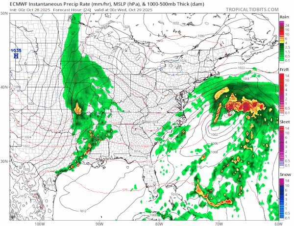 The low is also going to pick up Major Hurricane Melissa and force it northeastward across Jamaica today, and Southeast Cuba overnight into Wednesday morning, emerging in the Southeast Bahamas and then northeast toward Bermuda Thursday. This is happening while the front is whipping northward up the East Coast, essentially carrying Melissa to some extent on its northeastward track and away from the US East Coast.