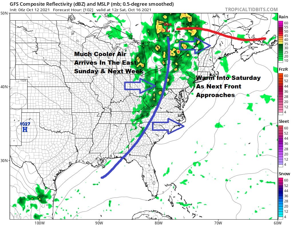 Sunday will be the better of the two weekend days as we will see sunshine but we will also see cooler than average temperatures. Highs will be in the 60s. The path from Canada opens up in the long range so that will bring a cooler flow and cold fronts coming through with more regularity. The dry weather pattern will continue into next week. Another front is likely around the middle of next week bringing even cooler air for the end of the next week. The pattern change will mean Autumn will finally gain some traction in the Northeast and Middle Atlantic states.