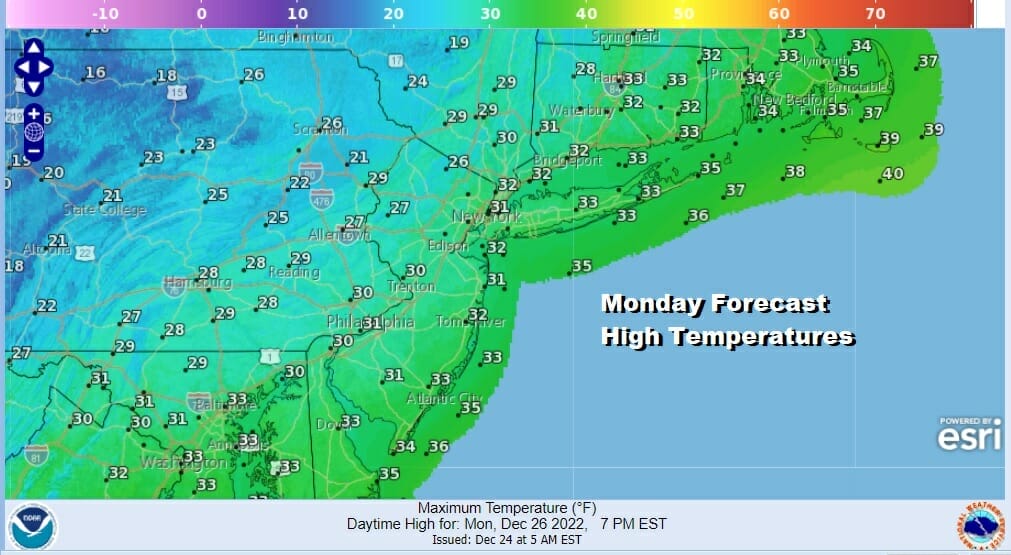 Tonight will be quiet with a few passing clouds. Lows will be in the teens inland and 20 to 25 coast and armer urban settings. Tuesday we will begin to see some movement higher. It should be of day of some sunshine and just a few high clouds. A weak system passes well south and east and bascially falls apart. Highs will be in the mid to upper 30s.