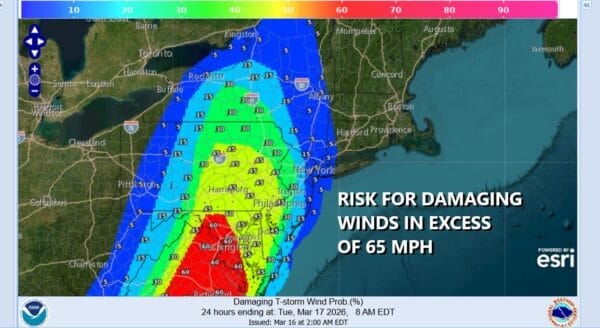 While much of the area in New York, New Jersey, and Pennsylvania are at a slight to enhanced risk for severe thunderstorms, the biggest risk I believe will be from potentially damaging winds as the front passes. Along with the development of strong convection, we have to consider the momentum of a weather front that is advancing at a rate of 40 to 50 mph from west to east. This will likely create a large area of strong wind gusts as the front approaches and passes through tonight. The worst of this will be from 7pm to about midnight from west to east.