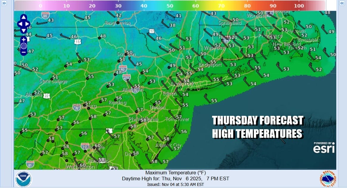 All high wind warnings and wind advisories are discontinued. While we did see strong winds gusting to 50 mph overnight, our storm system to the northeast is moving out faster to the east so the gradient has relaxed to some extent. It will be a breezy day and much of Eastern Pennsylvania to Southern New England will see sunshine along with a few clouds. Temperatures this afternoon will be on the cool side with most highs in the middle 50s, a little lower to the north and a little higher to the south. There is some lake effect precipitation going on in Upstate NY but we do not expect any of what is on the radar to head down closer to the coast.