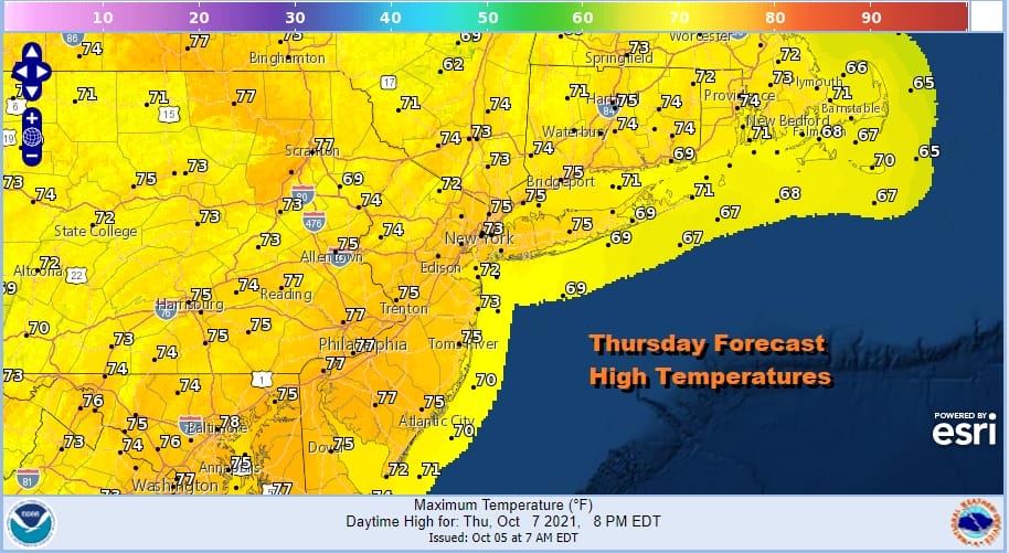 We have gotten it bit of help from high pressure in Northern New England. It has built far enough south to allow for some dry air to move and we have on the whole a partly sunny day underway. There are some clouds over parts of Pennsylvania and points southward thanks to tropical moisture in the Southeast. Some of that moisture has pushed northward but not enough to produce any shower issues. The radars are quiet and will remain so probably through Saturday. Thanks to the sun, we are seeing highs reaching into the low and middle 70s.