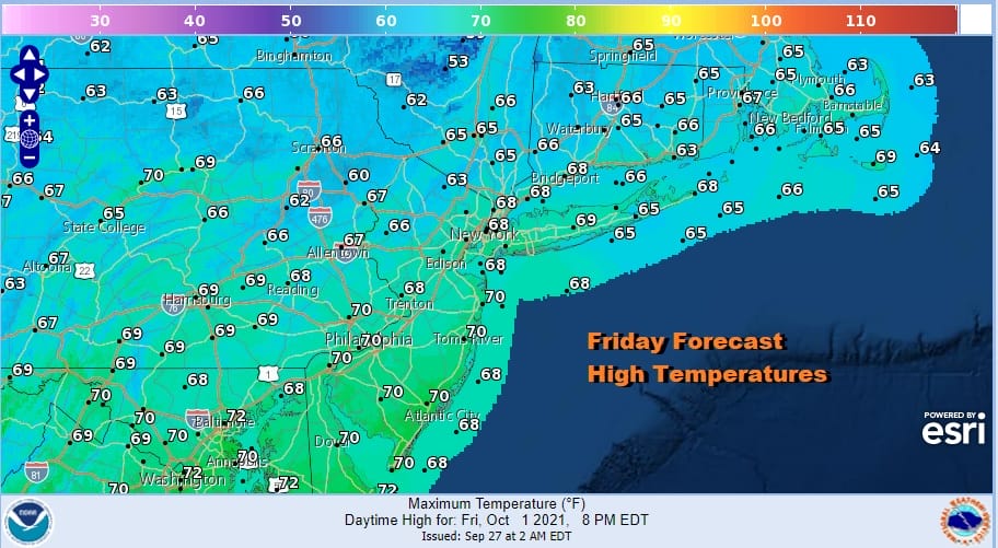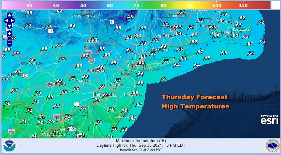 Moving through the rest of the week it is fairly straight forward. The upper trough off the East Coast will keep Hurricane Sam well offshore. We will see clear skies tonight with most lows in the 40s inland and low to mid 50s in warmer urban locations and along the coast. Thursday looks nice with sunshine taking highs to the 60s everywhere.