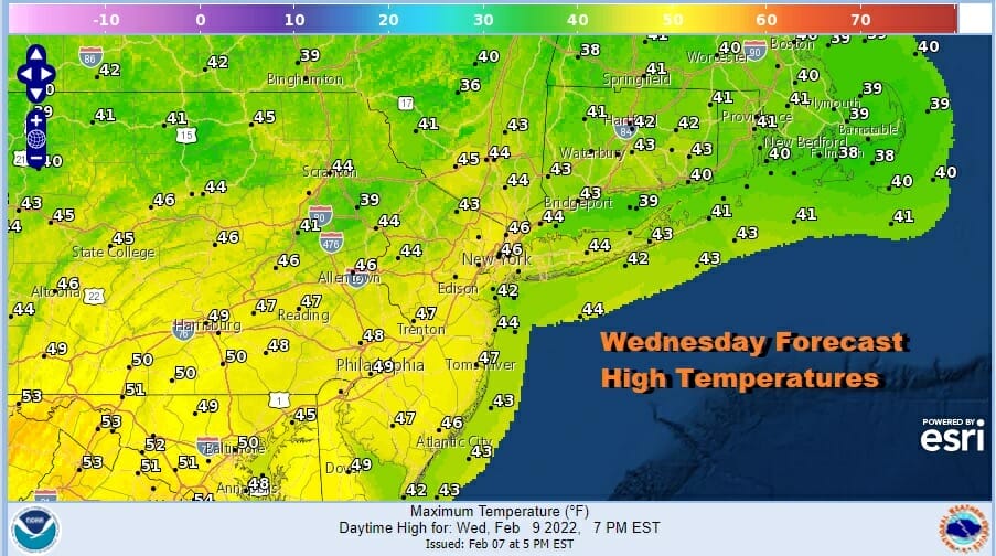 Thursday will be a partly sunny day on the other side of that front with a northwest breeze. Highs will be in the low to mid 40s. However areas in South Jersey and Southern Pennsylvania could see highs approach or even break over 50. Friday will be a nice sunny day with similar temperatures. Highs again will be in the mid 40s to lower 50s.