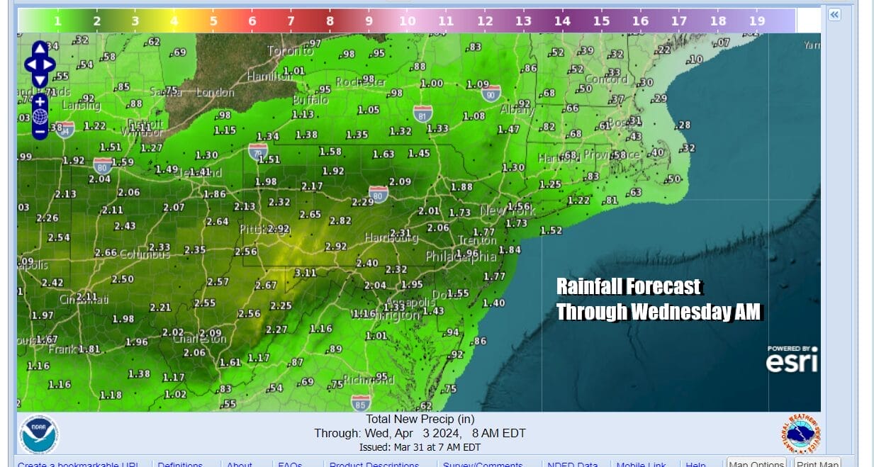 Wednesday morning we see a very large are of 2 inches or more of rain in the Central Appalachians with 1 to 2 inches reaching into Southern New England and the Hudson Valley southward. Since the rain is somewhat spread out over 3 days, it may reduce flooding concerns but we need to watch the situation closely since thunderstorm risk means there is the risk for some locally higher amounts.
