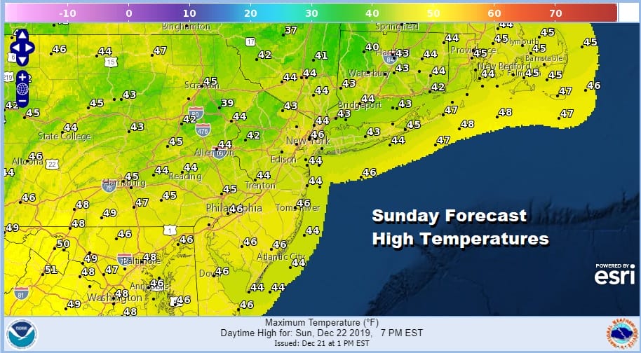 Monday should be the warmest day of this stretch of moderation with clouds and some sunshine. Highs should reach the upper 40s and lower 50s. Christmas Eve sees that weak cold front pushing through as high pressure builds to our north. The air with that high is not all that cold. Nor do we have much moisture to play with so other than some clouds, we should see some sun in the mix. Highs will be mostly in the 40s Christmas Eve with no rain or snow issues at all.