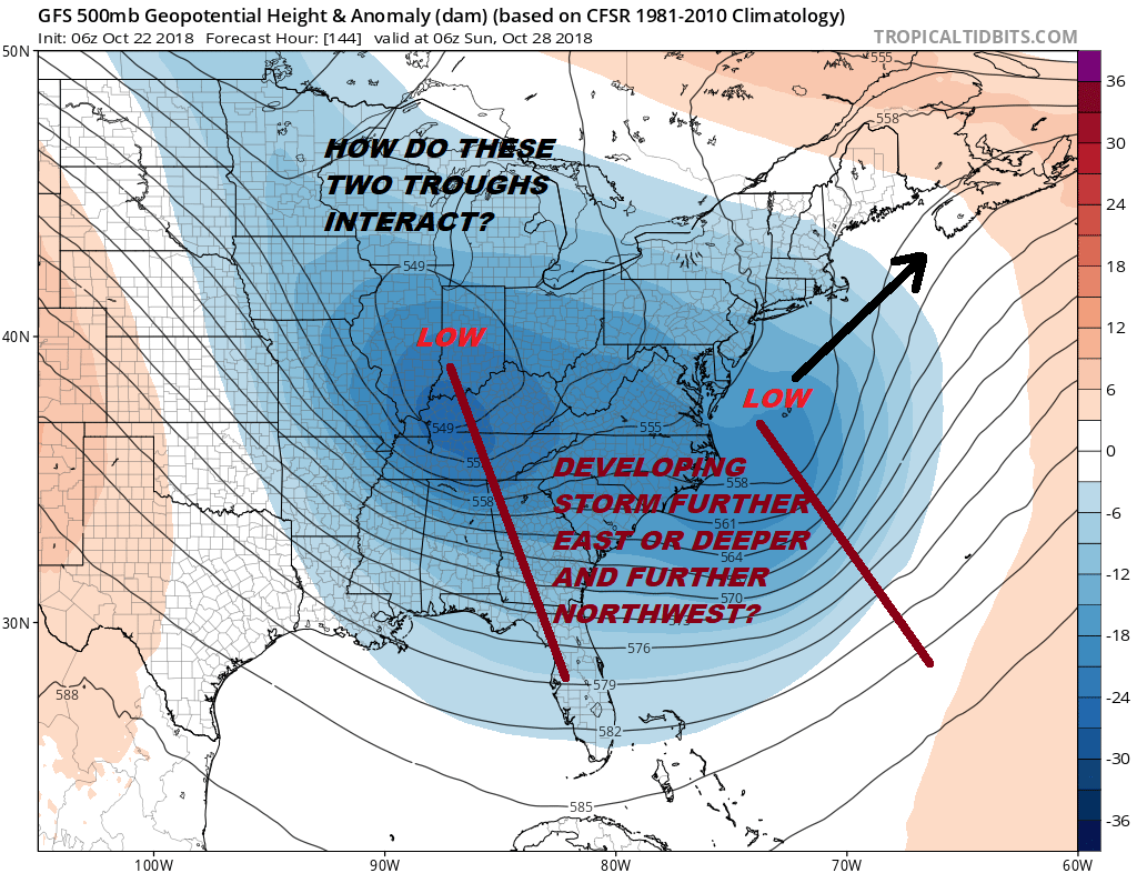 The upper air shows the battle here between the 2 troughs. The GFS has been trending toward the idea of the trough along the East Coast to be kicked away to the northeast rather than being lifted up to the north. A kick to the northeast makes for a flatter potentially colder solution. The upper low to the west is going the be key here. If it lifts it northward it makes for a stronger storm with wind and rain. We still aren’t there yet regarding the weekend but we are getting closer.