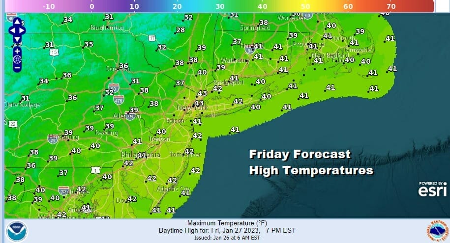 We have arrived at the end of the week and weather conditions have improved somewhat overnight. There are weak cold front in the flow and this should keep precipitation to a minimum this weekend with no issues until Sunday night. In the meantime today it is a little colder than yesterday. We do still see patchy clouds on the satellite loop and this should leave us in partly sunny skies today with most highs reaching the lower 40s. Radars are showing some snow showers in Upstate NY coming off the Great Lakes but these are of no concern to us. There will be a few clouds around tonight so lets call it partially clear skies with most lows in the 20s to lower 30s.