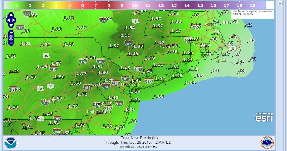 The National Weather Service rainfall map has also doubled its total rainfall amounts to between 1 and 2 inches for everyone from Eastern Pennsylvania through Southern New England and everyone in between. It is hard to believe that we have seen only 1 widespread rain event at the beginning of this month and it was from the noreaster conditions we experienced while Hurricane Joaquin was over the Bahamas.