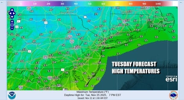 Behind the front winds will shift to the northwest and increase during the night and especially during Thanksgiving Day. A cold air mass will be building in from the west and low pressure in Eastern Canada strengthens so winds will be picking to gusts of 30 to 35 mph during Thanksgiving Day. We will see a mix of sun and clouds and temperatures will only be in the low to mid 40s for highs.