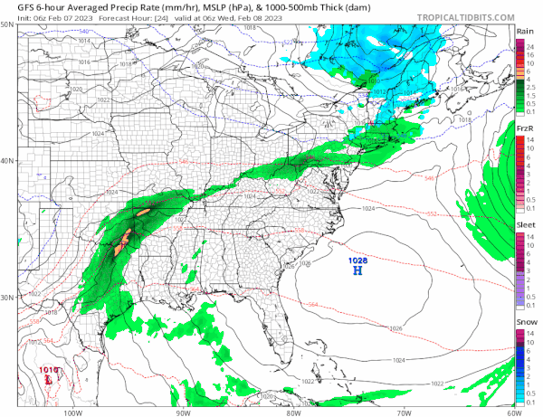 Low pressure moves across the Tennessee Valley and then heads offshore. There will be a minimal amount of cold air and there will also be an upper air feature that will dynamically cool the atmosphere from the top down. This probably means some sleet and wet snow for somebody out of this but it will be done with borderline temperatures.