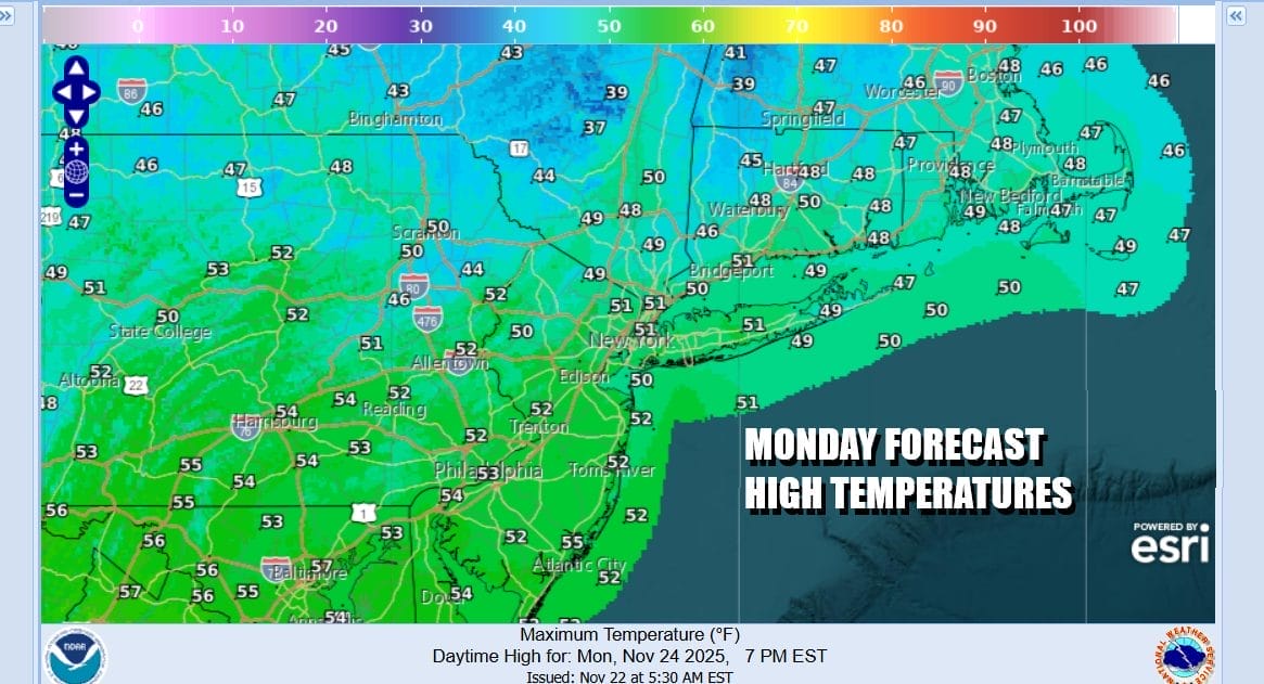 Thanksgiving week is going to start dry as we have high pressure overhead Monday and moving slowly offshore. This is going to be followed by another weather system heading for the Great Lakes and a trailing cold front that will approach the East Coast Tuesday. This is our once chance for precipitation this week and it will be more of a nuisance than anything as it is poised to move through without creating any complications.