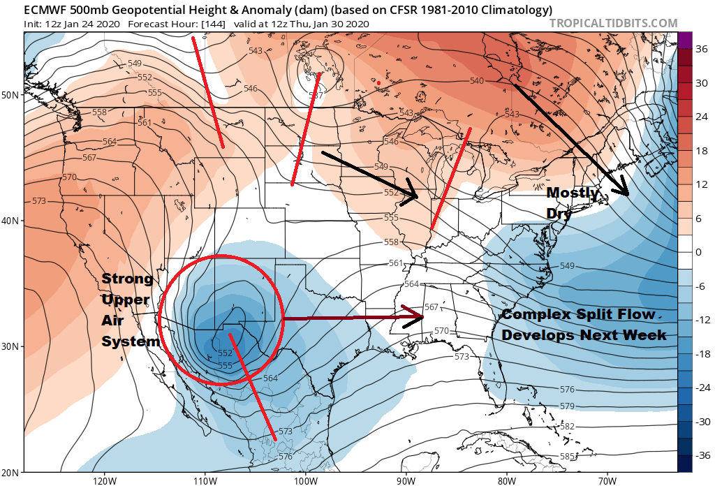 We have a split flow ahead for next week which should keep things dry, uneventful and temperatures near normal for the most part. Weather models will continue their slow dance every six hours taking a storm at the end of the week and every place other than the one where it will ultimately wind up so I’m not wasting any time or energy on it right now to satisfy the never quenced thirst of snow weenies. Suffice to say that timing of the two energy streams will pretty much drive any development late next week and we have days to figure this one out.