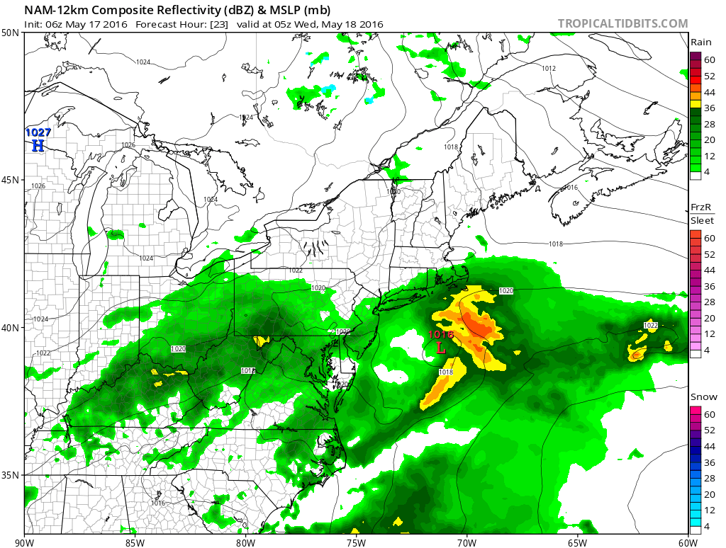 Clouds have rolled in this morning and there is rain on the radar to the south with a northern area of rain on the radar coming toward New York City but much of that is aloft and the air at the surface is very dry. This rain will have a tough time reaching the surface. The main area to the south will probably make it as far north as Central New Jersey, Southeast Pennsylvania to about New York City and Long Island before it begins to drop southward overnight and Wednesday morning. Temperatures today should make it into the 60s but once it starts raining temperatures will drop back into the 50s.