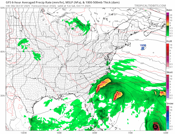 Attention shifts over the weekend to the Southeast US coast. Lower than normal pressures will be in place and low pressure develops off the east coast of Florida, moves northward, and intensifies some. Overnight weather models continue to show diverse solutions ranging from lows moving northward up the coast and spreading noreaster conditions as far north as Southern New England, to the low getting trapped off the Carolina coast and even acquiring tropical characteristics before moving inland over the Southeast US. The forecast is clouded also by a possibly hurricane well to the east that likely will indirectly affect any development near the coast. Right now we are going to indicate a dry Saturday followed by clouds rain and wind moving up the coast Sunday and Monday, Columbus Day. We expect to see more model adjustments in the coming days so the forecast outlook is wide open for changes.