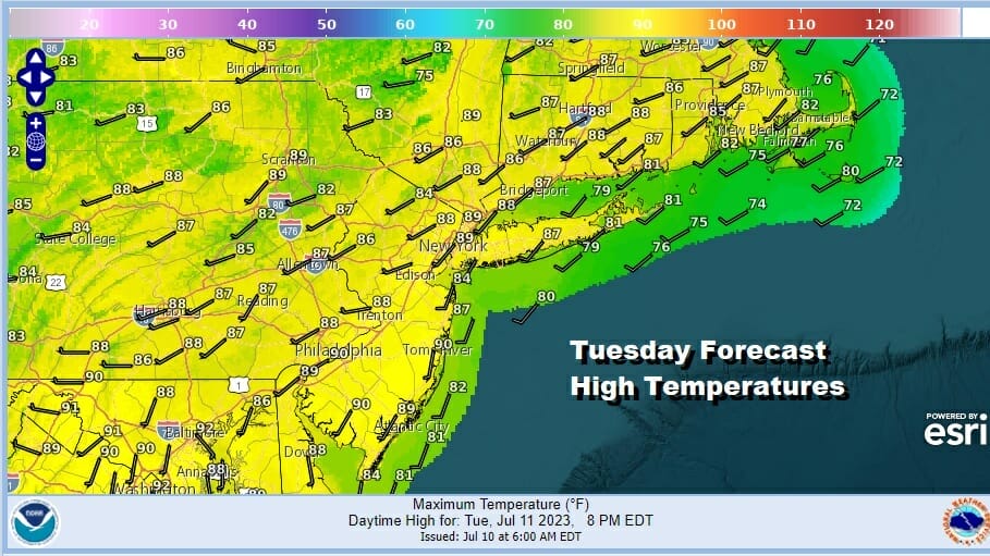 After the orderal of Sunday and Sunday night it is time for a little bit of a break for the Northeast. Low pressure is in Northern Vermont and moving northward. That is helping to funnel dry air into the rest of the Northeast and Middle Atlantic states. Humidity levels are not all that high today as dew points have dropped to the upper 50s and lower 60s so it should be comfortable. At least compared to dew points in the 70s, this is downright delightful. Sunshine will take highs to the upper 80s to near 90 degrees in most areas and it will be a little cooler at the shore. Other than an isolated shower or thunderstorm, it is a rain free day for 99.9 percent of you.
