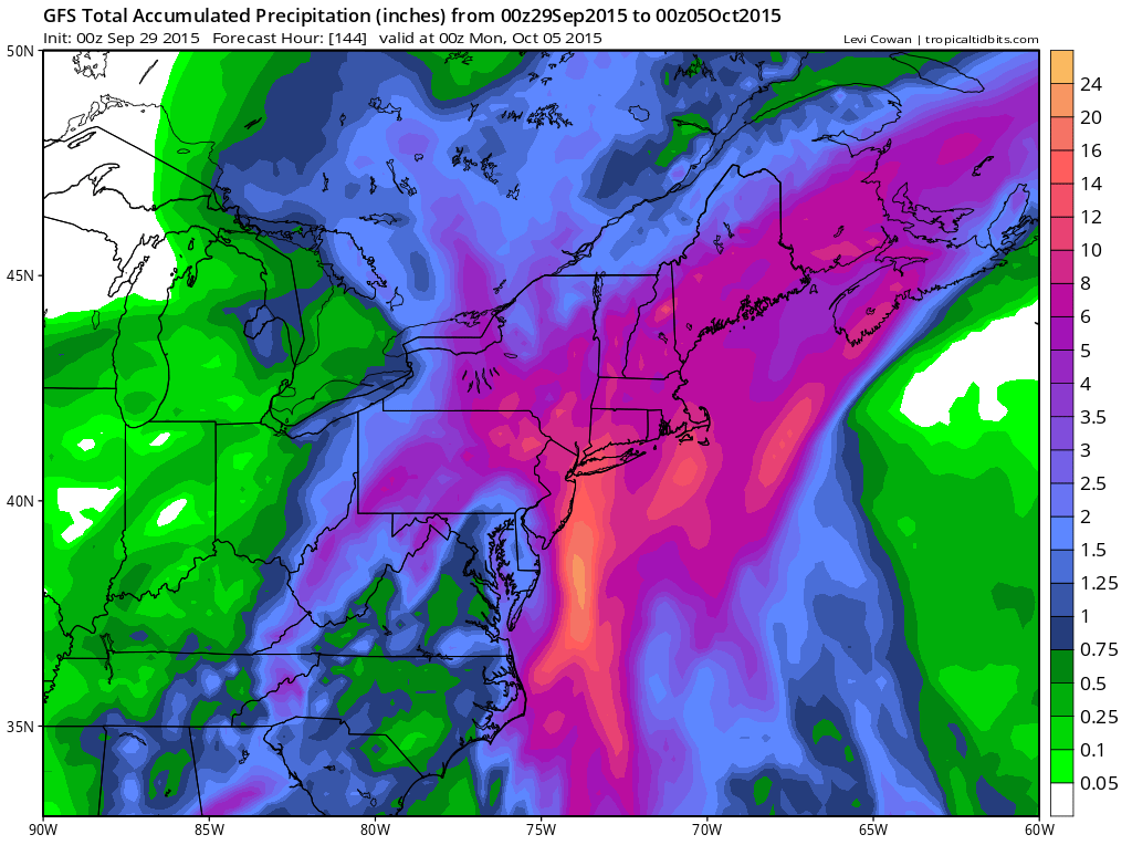 Now with regards to act 2 of this play this will all hang on the big high building across Northern New England and Eastern Canada, the deep trough that forms in the east, and the ultimate track of Tropical Storm Joaquin. The GFS has incredible total 6 day rainfall totals in excess of 6 inches in a very large area. Certainly these will be drought busting rain amounts if this all plays out. This is in response to the deep trough that creates a strong southerly flow along the east coast from the Bahamas straight north to upstate New York.