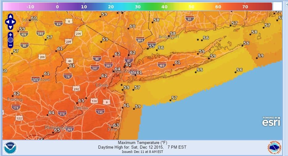 More record temperatures will be going by the wayside over the next 3 days from Southeastern Pennsylvania through Southern New England. Low pressure is going by well to the north and west. We have a west to southwest flow through Saturday. Sunday the wind may go more south so that could hold numbers down a bit along coastal areas including Long Island however the bottom line is that we will reach the 60s each day and that will take out records at some places in New Jersey especially central and south Jersey. Here are the forecast high temperature maps for the next 3 days beginning with today.