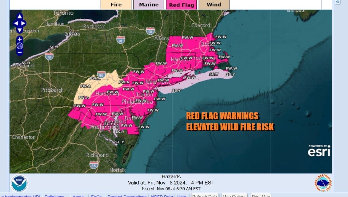 Dry conditions across the Northeast and Northern Mid Atlantic states have become extreme in some places. The combination of very dry air and gusty winds have made the area ripe for potential wildfires. Red Flag Warnings are posted for a large area from Northeast Virginia and Delaware northeast to Southern and Southeastern New England including all of New Jersey, the Hudson Valley, New Jersey and Long Island. It also includes all of the major and not so major urban areas from from Washington and Baltimore to Philadelphia, New York City, Hartford, Providence, and Boston.