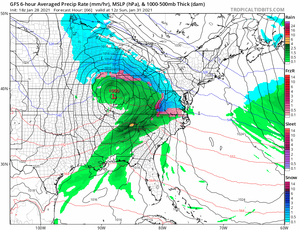 Now we have the surface to look at. It seems to set up in a bullish pattern with cold high pressure in Eastern Canada that doesn’t give way much if at all. Cold air wedges south down the East Coast east of the Appalachians. Low pressure heads across the lower Ohio Valley. The primary low dies out. The secondary develops in the Carolinas and pushes northeastward. Again there should be room for the low to move northeast and offshore east of Delaware and south of Long Island.