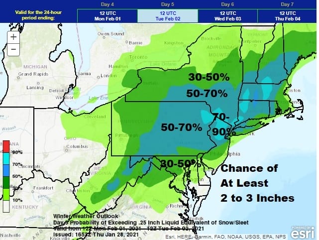 There are still multiple ways that this could change though the range of changes is now growing smaller. It is too early for numbers and you should avoid forecast shopping. WPC is bullish here, and more than any system we have seen this winter (not that there have been many). To show 70 to 90% chance of at least 2 to 3 inches in their long range day 4 forecast is a rather confident statement regarding this storm. Specific numbers will come out over the weekend from me at least and from the weather service which is would be a far more appropriate time for amount speculation.
