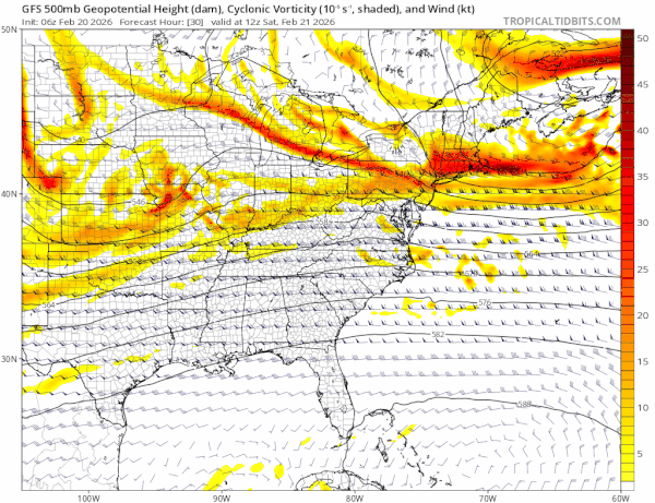 We move on now to the weekend and attention is going to turn to an intense short wave trough that will be diving southeastward from the Northern Plains while a big strong high builds across Southern and Eastern Canada and then necks southward into the Northeast and Northern Mid Atlantic states. Another short wave in the southern jet stream will spawn a low in the Southeastern US Saturday night and then the low turns northward.