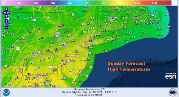 Now we wait to see what happens to those storms to the west as they move eastward this evening. After this cold front passes offshore the storms should diminish and disappear after midnight with leftover clouds. Sunday will see clouds and some sun and only some scattered showers or a thunderstorm. Highs will be in the cooler low to mid 80s though the humidity will still be a bit on the high side.