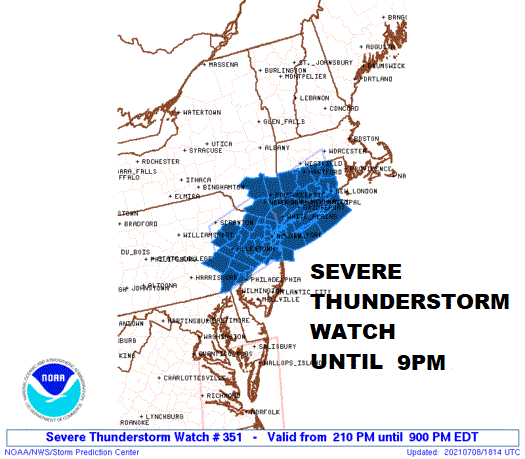 The Storm Prediction Center has posted a Severe Thunderstorm Watch effective until 11pm. Don’t be surprised if another one follows for overnight as Elsa comes into play. The watch extends from Southeastern Pennsylvania northeast across Northern and Central New Jersey, the Lower Hudson Valley, most of Connecticut and Long Island. This includes NYC and Philadelphia. Here are a list of counties.