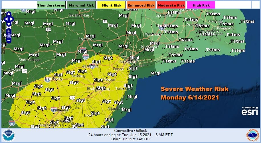 The area of risk extends into Upstate NY and Southwestern New England to the north and covers just about all of New Jersey, all of Pennsylvania, south to Maryland and Virginia. Slight risk is indicated from Northeast Virginia northeastward to Northern New Jersey.