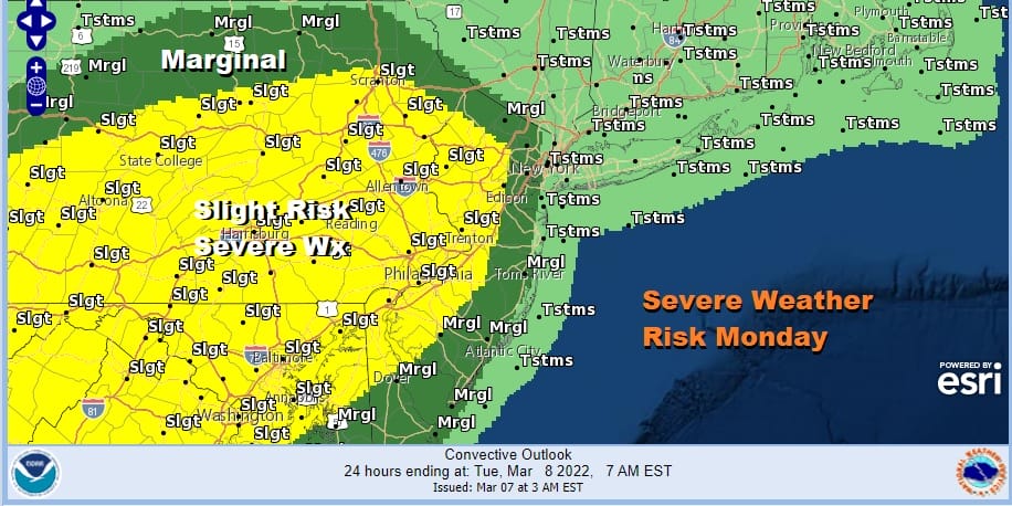 We have an interesting week ahead of weather that brings the volatility of March front and center. It begins today with an approaching cold front and warm air pushing up the East Coast. This opens up the risk for severe weather inland and the Storm Prediction Center has a marginal to slight risk of severe weather mainly from New Jersey and Pennsylvania south and west into Maryland, Delaware, and Virginia. We are seeing a warm sector setting up over this area and when the cold front approaches later this afternoon and evening we will see showers and thunderstorms.