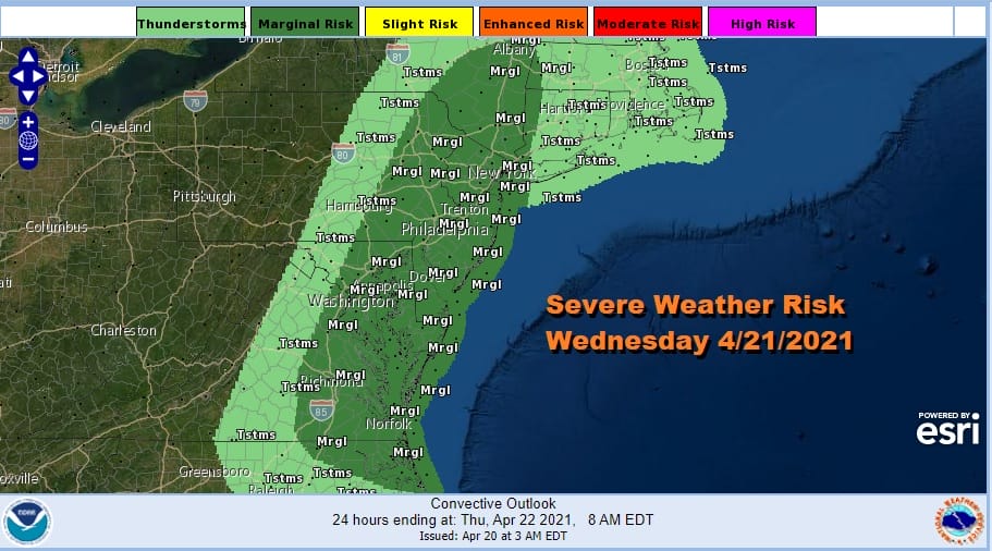 Once the line of thunderstorms reaches the longitude of NYC it should weaken as it heads east. This is because the winds on Wednesday will be mostly from the south and that means that areas that face the Atlantic Ocean from the north like Southern New England and Long Island have a marine influence in there which makes the atmosphere less unstable and therefore less supportive of thunderstorms holding together. This is typical of the spring.