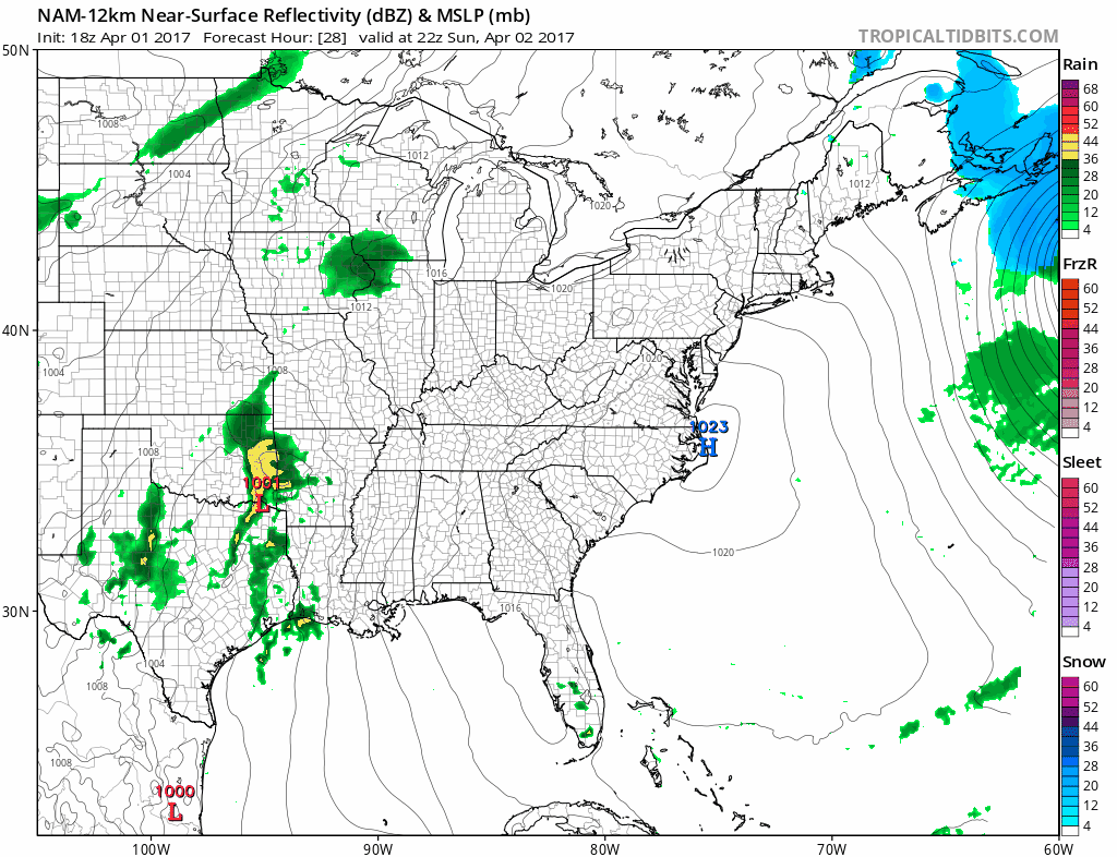 You can see the NAM model view of this for Sunday evening as the low forms and thunderstorms develop in East Texas and Louisiana. The strong flow from the Gulf of Mexico is quite strong with winds of 40 to 50 knots at 5000 feet bringing in rich tropical Gulf moisture.