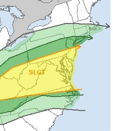 Thursday’s severe weather threat area as shown by the Storm Prediction Center is in my view a little overdone on the northern end. The slight risk for severe weather makes sense to me but I think there is a greater chance from Southern New Jersey (southern 3 counties) and less so to the north. In fact I believe that north of 195 which will be about where the warm front will lie, will probably have showery rains to deal with and the chance for a thunderstorm. But I don’t think it will be severe.