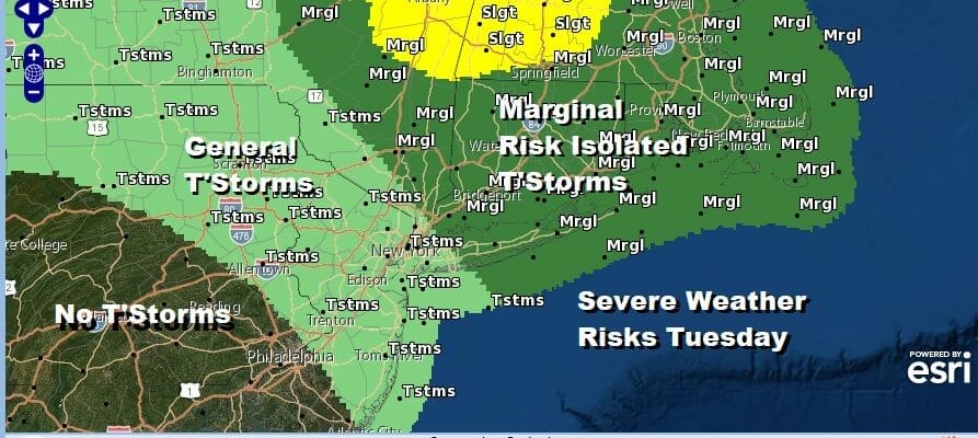 A cold front is moving through today and we had some overnight showers and thunderstorms play through. Now we wait for another round of showers and possible thunderstorms into this afternoon but the main area of development for severe weather will be from NYC and the Hudson Valley north and east with a marginal risk being indicated for Southern New England and Long Island to the Hudson Valley. General thunderstorms are possible as far south as Central NJ to Northeast Pennsylvania. No thunderstorms are forecast for Southeast Pa and points west and south.