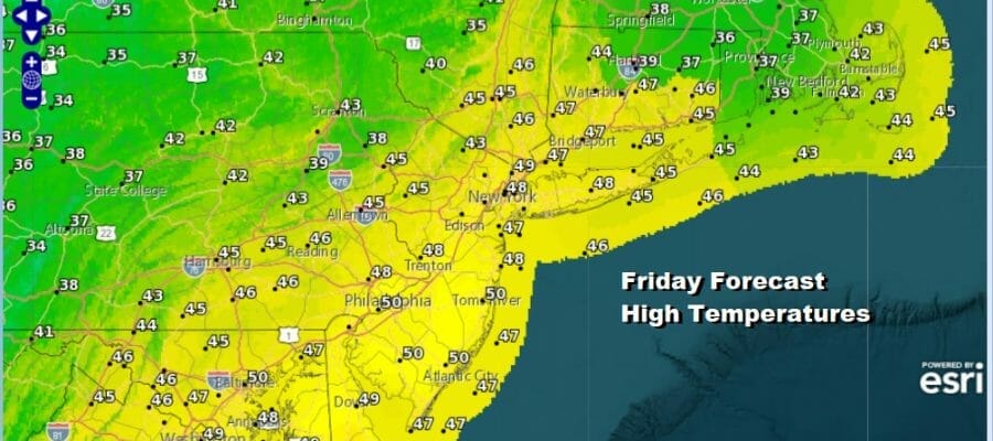 We haved moved away from the very warm weather of a few days ago and we will continue to slowly step down as far as temperatures go over the next few days. However we will still be seeing above average temperatures this weekend. An upper trough and a weak surface system are combining to produce a lot of clouds today and the radars are showing patchy areas of rain. Such is our day today with cloudy skies and we will see some rain from time to time and no rain from time to time as well. Highs today will be mostly in the low to middle 40s. Areas in Southern NJ will reach up into the lower 50s.